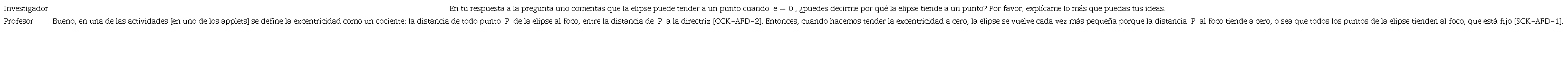 Tres participantes expresaron que cuando , la elipse, además de tender a la circunferencia, también puede tender a un punto [SCK -AFD-1] si se le considera como el lugar geométrico de un punto P que cumple ciertas condiciones en relación con un punto y una recta, ambos fijos [CCK-AFD-1]. Ninguno de ellos fue explícito respecto a las condiciones que debe cumplir P , así como tampoco explicaron por qué la elipse tiende a un punto. Los otros dos profesores no mostraron nuevos conocimientos.