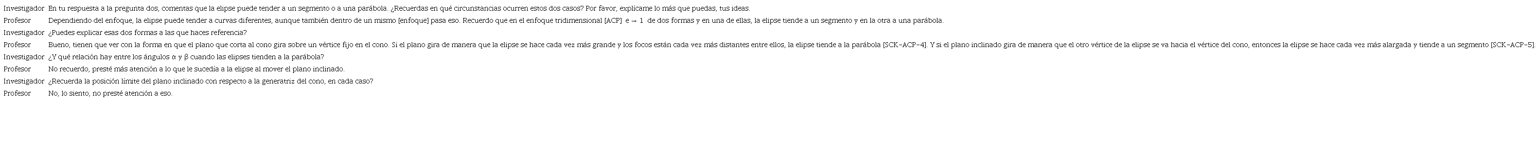 Dos participantes respondieron que si , la elipse tiende a un segmento; uno de ellos explicó “cuando los focos tienden hacia los vértices el semieje menor tiende a cero y entonces la elipse se ‘alarga’ hasta parecer un segmento” [SCK-AB-5). Un tercer docente, sin dar explicaciones, comentó: “la elipse puede tender a un segmento o a una parábola, dependiendo del enfoque que se considere”. Un cuarto participante, de manera incompleta, explicó: “cuando el plano que corta al cono se mueve de manera que su ángulo de inclinación y el ángulo en la base del cono tiendan a ser iguales, la elipse tiende a una parábola” [SCK-ACP-3]. El participante restante no mostró nuevos conocimientos.
