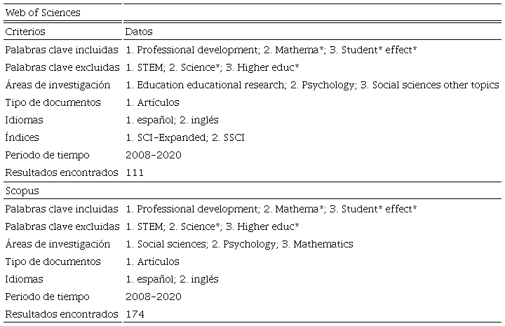 Como primer paso de esta revisión, de acuerdo con lo planteado por Boote y Beile (2016), tomamos una perspectiva exploratoria para lo cual identificamos palabras claves generales que referencian el campo y tema en estudio, que apa-recen en artículos altamente citados del área. Usamos como base palabras como: "professional developmen" y "mathematics" (Sowder, 2007; Sztajn, 2011), cabe mencionar que esta última palabra incluye a "mathematics education" por el método de búsqueda del algoritmo. Además, definimos como tiempo de búsqueda los años 2008 a 2020, en las bases de datos de corriente principal Web of Sciences (WoS) y Scopus. Estas bases de datos fueron escogidas debido a su calidad, trayectoria y cantidad de revistas indexadas. Luego, refinamos la búsqueda con los criterios mostrados en la tabla 1, en que agregamos la palabra clave “students effects” debido a que este estudio busca la relación entre programas de DPD efectivos y aprendizajes de los estudiantes. Además, excluimos las palabras “STEM”, “science” y “higher educ*” debido a que buscábamos programas exclusivamente centrados en matemática y para profesores de educación primaria y secundaria.