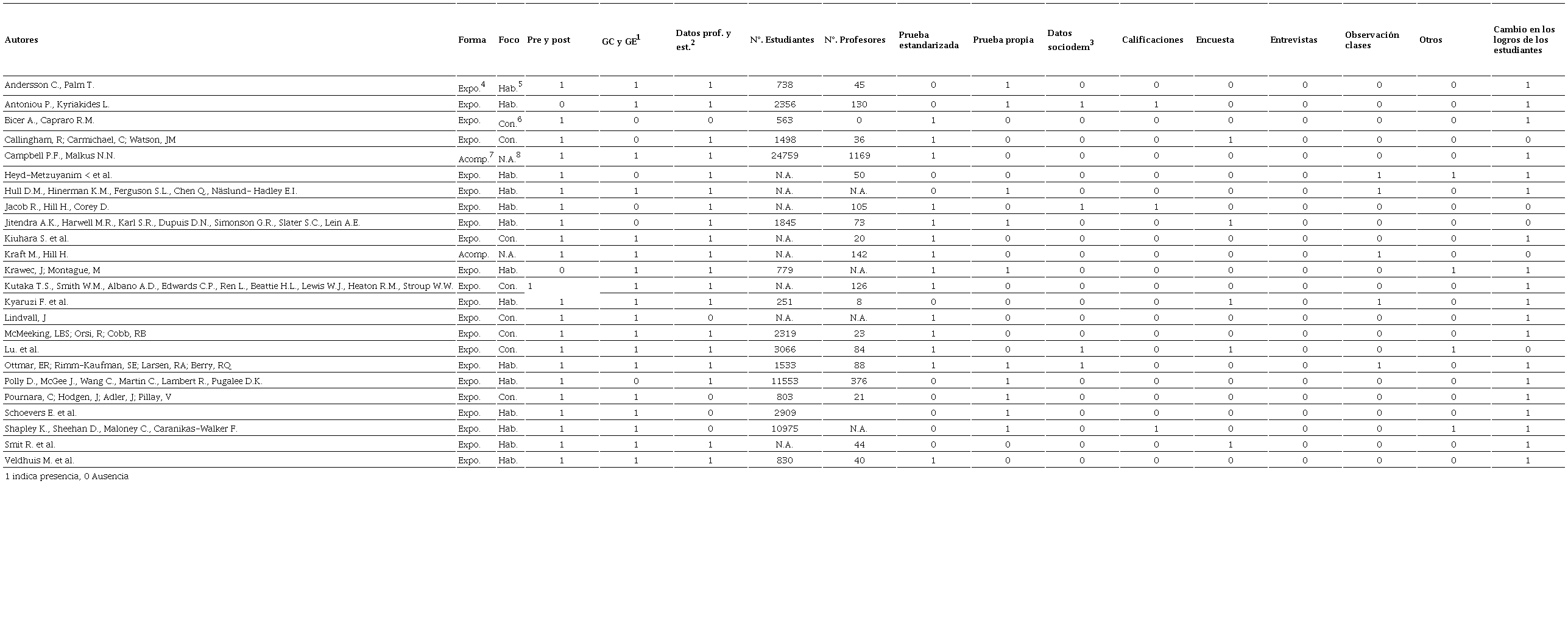 Los 35 artículos que son parte de esta revisión de literatura, han sido leídos minuciosamente con el fin de identificar información relevante respecto de su diseño metodológico y describir los programas de DPD que eran objeto de la investigación reportada. De este modo, para cada artículo identificamos: a) idioma en que está escrito; b) país donde fueron levantados los datos; c) características de efectividad del DPD (Desimone, 2009); d) objetivo de la investigación; e) metodología del estudio; f) instrumentos/datos utilizados; g) muestra; h) datos de los estudiantes analizados; y i) resultados obtenidos en los logros de los estudiantes. Adicionalmente, proponemos una categorización de cada investigación según lo que busca desarrollar el DPD en los docentes, que llamamos “Foco” y otra categorización que abarca la forma de trabajo incorporada en el diseño de la actividad, llamada “Forma”. Esta última nace a raíz de lo planteado por Ávalos (2007) donde se establece que existe una tensión entre lo que se entiende por “capacitación” y “desarrollo profesional”. En los resultados explicamos “Foco” y “Forma” en profundidad.