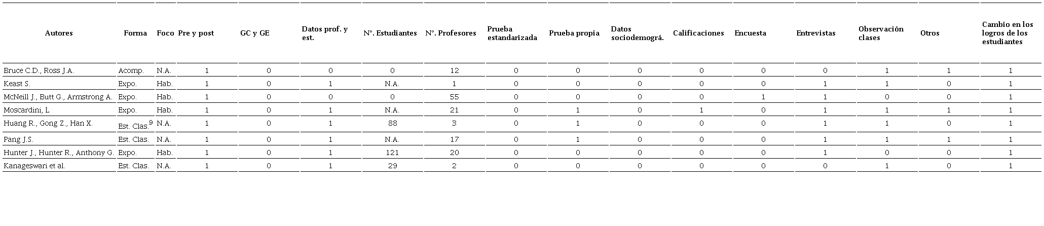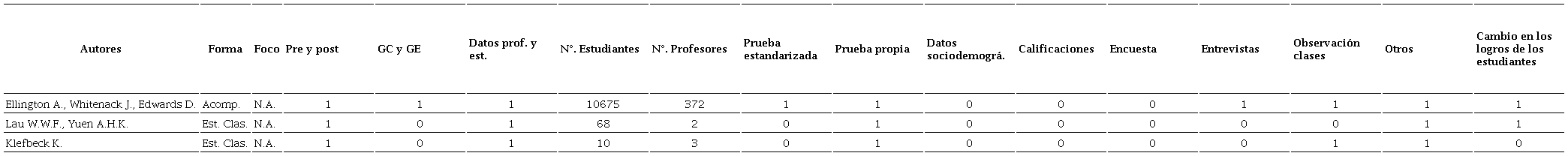 Por último, identificamos una tendencia clara hacia un tipo de diseño en común entre los tres artículos que utilizan métodos mixtos de investigación ya que, como es posible apreciar en la tabla 4, los estudios abarcan una cantidad totalmente opuesta de profesores y de estudiantes, a la vez que solo coinciden en un instrumento. Esto se podría deber a que la cantidad de trabajos es muy pequeña y no nos permite establecer aspectos recurrentes para la evaluación de los aprendizajes de los estudiantes ni el cambio de prácticas docentes.