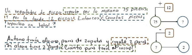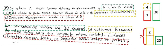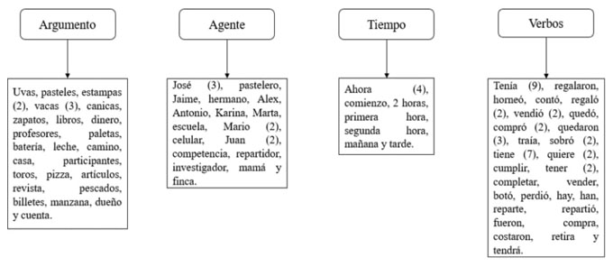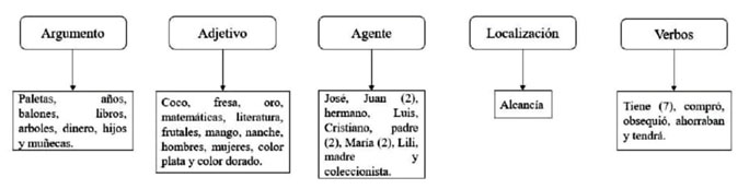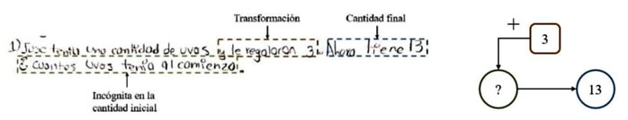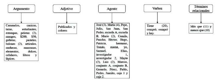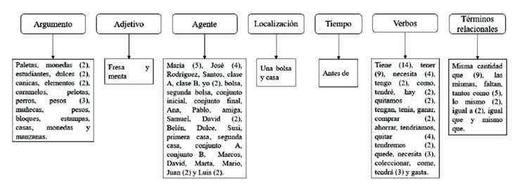 Por otra parte, en el análisis se informó sobre la dependencia semántica existente en el enunciado, considerando siete tipos de palabras o términos, útiles para identificar por fragmentos las relaciones presentes en el problema (Nesher, 1982; Puig y Cerdán, 1988). Con lo anterior, se identificó en cada enunciado los elementos que dieran información de la dependencia semántica. Con el objetivo de dar a conocer si estos elementos eran suficientes o no para que un PAEV sea asociado a la categoría de cada estructura semántica. Con base en los trabajos de Nesher (1982); Puig y Cerdán (1988) a continuación se describe cada elemento, en función del enunciado presentado en la figura 2.