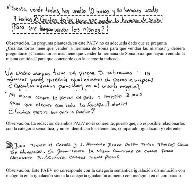 En cuanto a los cuatro PAEV asociados a la estructura de igualación, el primer PAEV relacionado con la categoría de igualación aumento con incógnita en el comparado no presentó indicios verbales (Castro et al., 2014), además en el enunciado se hace uso incorrecto del término relacional para la igualación de cantidades (¿cuántas tortas tiene que vender la hermana de Sonia para que vendan las mismas? / ¿cuántas tortas más tiene que vender la hermana de Sonia para que hayan vendido la misma cantidad?). El segundo y tercer PAEV, no presentaron los elementos suficientes de la estructura semántica para asociarlos con las categorías correspondientes. Por último, el cuarto PAEV propuesto correspondía a una categoría diferente a la indicada. En general, las dificultades estuvieron asociadas a la estructura semántica de cada categoría y a ciertos elementos de la dependencia semántica.
