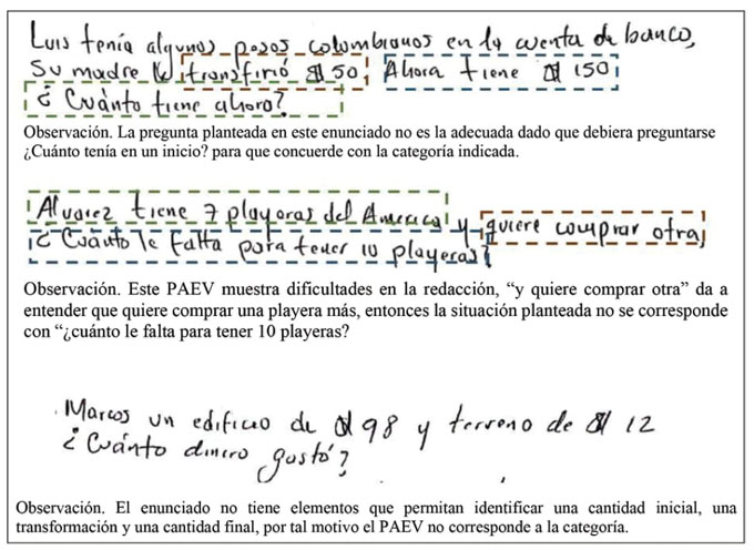 En investigaciones previas (Espinoza et al., 2016; Mateus-Nieves y Devia, 2021), se evidenciaron dificultades, para formular y resolver problemas aritméticos de enunciado verbal, dichas dificultades se relacionaron con la longitud del enunciado, el orden de presentación de los datos, la situación de la pregunta y el tamaño de los números utilizados, elementos que afectaron las estructuras semánticas, la dependencia semántica y la matemática de los PAEV. En esta investigación se encontró que algunos PAEV propuestos por los participantes no presentaron la estructura semántica para asociarlos a una categoría específica, en consecuencia algunas preguntas no se plantearon adecuadamente. Lo anterior no se puede generalizar porque se encontraron dificultades en siete de 77 PAEV propuestos.