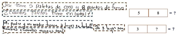 En la figura 6 se presentan dos enunciados de los PAEV propuestos para la categoría combinación con incógnita en el todo y con incógnita en B. En ambos casos existe coherencia en la redacción, dado que se identificaron los elementos que caracterizan al PAEV de cada categoría. En general los ocho PAEV fueron redactados acorde con cada categoría, pues se identificó la incógnita en el todo o en una de sus partes. Por otro lado, en las producciones no se identificaron PAEV en los que la incógnita estuviera en A, además, igual que en la estructura anterior todos son PAEV de una etapa.