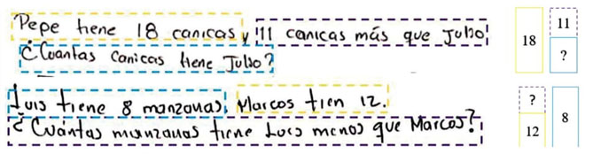 Mientras que en la estructura de comparación se parte de dos cantidades independientes que se relacionan mediante la comparación. En este tipo de problemas, la relación de comparación está dada por palabras que están presentes en el enunciado del problema, por ejemplo, “más que” y “menos que” (Cañadas y Castro, 2011; Castro et al., 1995; Orrantia et al., 2005; Riley et al., 1983). Según Segovia y Rico (2011), “en la comparación de cantidades, una de ellas actúa de referente y otra de comparado o referido. El resultado de la comparación de las dos cantidades es la cantidad diferencia” (p. 87). En la estructura de comparación hay seis categorías, tres de aumento y tres de disminución.
