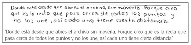 Clasificamos las respuestas de los estudiantes en tres categorías: Puntos en la recta (1 de 11 parejas), Cercanía (4 parejas), Minimización de residuales (4 parejas), Sin respuesta (2 parejas). Pertenece a la primera categoría la res- puesta de una pareja que asocia la recta de mejor ajuste a la minimización de distancia de la recta a los puntos, pero considera que “es mínima cuando pasa por casi todos los puntos”. Las respuestas de la categoría “Cercanía” sugieren que la recta de mejor ajuste debe estar cerca de los puntos, pero la forma de medir la cercanía es simplemente como la perciben, es decir, de manera subjetiva (figura 9) y sin precisarlas con ayuda del software, pero perciben que les da información de los residuos.
