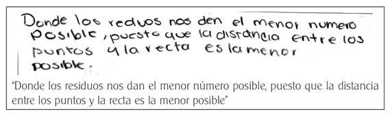 Un detalle que revela la dificultad para construir el agregado es que, al parecer, los estudiantes buscan minimizar los residuos individualmente e infieren que así se obtiene la distancia mínima de los puntos a la recta, pero no les parece natural minimizar la distancia global e inferir que al hacerlo se consigue una distribución de residuos de minimización óptima. Es decir, piensan que el control de los residuos particulares les permite controlar la distancia global, pero no a la inversa. En las respuestas a la pregunta que siguió, los estudiantes evidenciaron esta sutil dificultad.