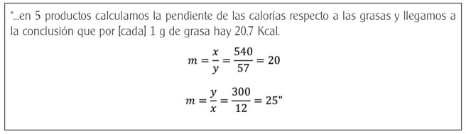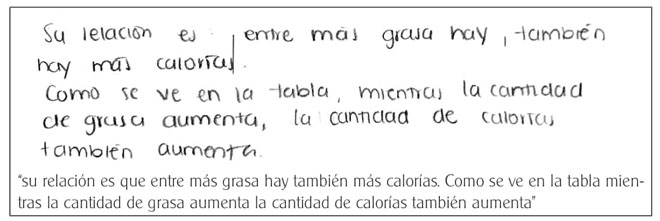 Frente a la pregunta sobre la relación entre gramos de grasa y calorías (1ª parte de la actividad 1), emergen dos enfoques: uno global-cualitativo y otro particular-cuantitativo. El primero evalúa la tendencia general de los datos y su descripción cualitativa; mientras que el segundo busca expresar los cambios específicos en cada dato a través de secuencias numéricas o funciones, aunque sin éxito. Ocho parejas ofrecieron una valoración cualitativa, observando una tendencia positiva entre grasa y calorías, ejemplificada en la figura 1, la respuesta es evidencia de la tendencia positiva al describir que ambas variables aumentan. Tres parejas intentaron un análisis cuantitativo utilizando proporciones para establecer una relación matemática, como se muestra en la figura 2.