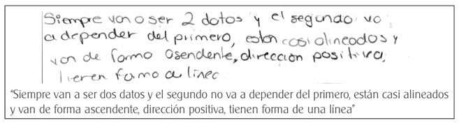 El efecto de utilizar el diagrama de dispersión, facilitado con el software, es significativo, porque con la visualización de los puntos emergen respuestas que muestran que perciben una tendencia (la categoría: casi-linealidad), pero también la irregularidad. Se siguen presentando en esta actividad respuestas que se enfocan en lo global, pero menciona, lo particular (figura 3) o que se enfocan