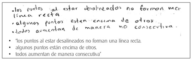 No es conveniente juzgar que las ocho parejas que utilizan un enfoque global tienen una visión agregada de la correlación simplemente porque observan la propiedad general y no se enfocan en puntos particulares. Lo que hace falta para desarrollarla es concebir el agregado correspondiente y la manera en que los puntos se combinan para construirlo. Tampoco es conveniente juzgar del todo inapropiada la estrategia de las tres parejas que buscan una regla para describir los puntos, ya que están buscando cómo combinarlos para obtener un objeto que describa la relación. De hecho, es lo que se debe hacer, solo que las herramientas con las que cuentan los estudiantes (secuencias aritméticas y proporcionalidad) no son las apropiadas. Juzgamos entonces que no son concepciones falsas sino embrionarias.