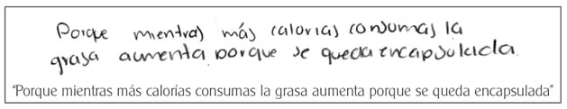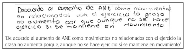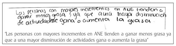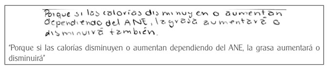En la Actividad 2, previo al uso del applet en GeoGebra, se repitieron preguntas similares a la Actividad 1. En la 1ª parte, pregunta (a), se solicitó describir las relaciones entre ANE y grasa. Cinco parejas indicaron una tendencia global, por ejemplo: “menos actividad implica más grasa”. Tres parejas reconocieron una dependencia entre ANE y grasa, sin establecer una regla definida, por ejemplo: “Si las calorías varían con el ANE, la grasa fluctúa” (ver figura 5). Las tres restan- tes basaron sus respuestas en un modelo contextual, por ejemplo: “El aumento en el consumo de calorías incrementa la grasa” (ver figura 6).