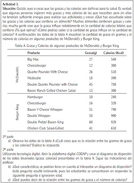 El análisis de las relaciones entre dos variables con base en un conjunto de datos bivariados es un problema genuino para los estudiantes porque no cuentan con un procedimiento previamente aprendido para hacerlo. Elegimos datos bivariados en un contexto de nutrición, el cual puede ser de interés debido a que se relaciona con la salud y las costumbres alimenticias. La utilización de datos de variables de la vida real del estudiante puede ser un factor importante tanto cognitivo como motivacional para propiciar el aprendizaje de la estadística (Garfield y Ben-Zvi, 2008; Neumann et al., 2013).