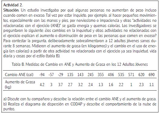 La diferencia con la actividad 1, aparte del contexto, es que ahora la tendencia es negativa, es decir, mientras una variable aumenta la otra disminuye. La variable ANE es menos familiar para los estudiantes, aunque la asimilan a la idea de movimiento no relacionado con el ejercicio. Probablemente por la falta de familiaridad de la variable ANE, los estudiantes no notaron que lo que se mide es el cambio de ANE y no la actividad misma; de ahí que se tengan valores negativos, que significan pasar de una actividad intensa a una actividad más leve. Probablemente por esto los resultados no son mejores a los obtenidos en la actividad 1, debido a que se presentaron respuestas basadas en creencias previas sobre el contexto sin atender a la información que proporcionan los datos. De cualquier manera, el objetivo de esta primera parte es introducir a los estudiantes al contexto de la situación del problema, y proponerles utilizar el programa en GeoGebra para centrar su atención en la idea de distancia de un conjunto de puntos a una recta y la de minimizar la distancia.