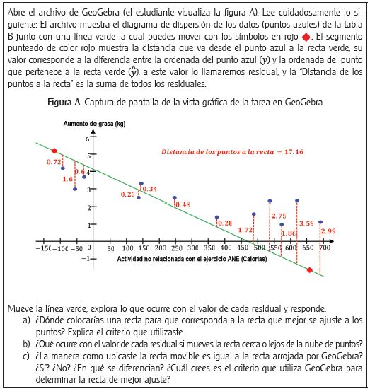 Momento 3: residuos y distancia de una recta a la nube de puntos. Entre las estrategias propuestas por los estudiantes en la tarea previa se destaca la que utiliza el criterio de la cercanía de los puntos a la recta; esta se operacionaliza con el uso del programa de GeoGebra que describimos previamente. En efecto, el programa permite introducir el concepto de residuo junto con la manera de medir los residuos con relación a cualquier recta dada; entonces se tiene una manera operativa de definir la distancia de la nube de puntos a una recta y decidir que la que mejor ajusta a los puntos minimiza dicha distancia.