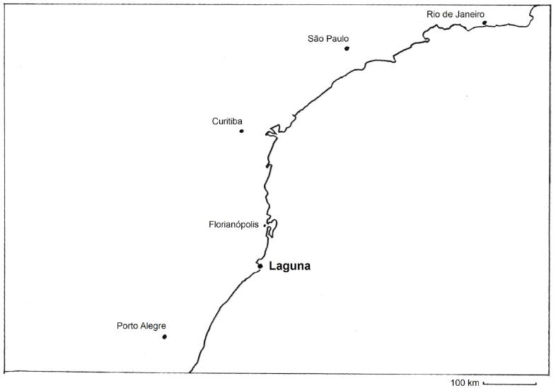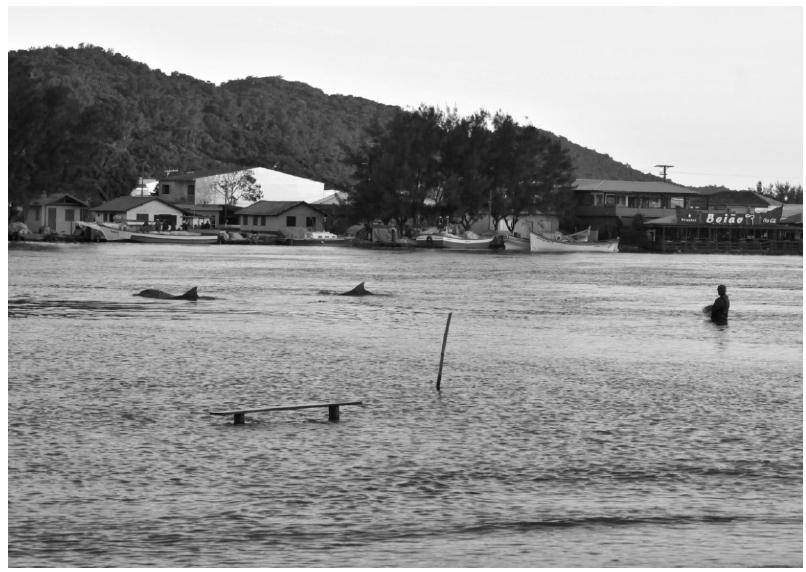 No Brasil, o relato aparentemente mais antigo de fenômeno semelhante refere-se à relação entre um boto-cor-de-rosa (Inia geoffrensis) e um pescador, na região amazônica, onde o animal encurralava os peixes e recebia em troca uma parte do pescado14. Na região de Pipa (RN), Caravelas (BA) e Baía de Guaratuba (PR) também foi relatada a presença de golfinhos encurralando tainhas na direção de redes pesqueiras15. Situações semelhantes também foram registradas nos litorais do Rio de Janeiro e São Paulo16. Nas proximidades de Laguna, fenômenos similares ocorrem nos rios Araranguá (SC), Mampituba (entre SC e RS) e Tramandaí (RS). Além de interações de pesca com humanos, há relatos de “pescas associativas” entre golfinhos e aves marinhas na região de Cananeia (SP)17.