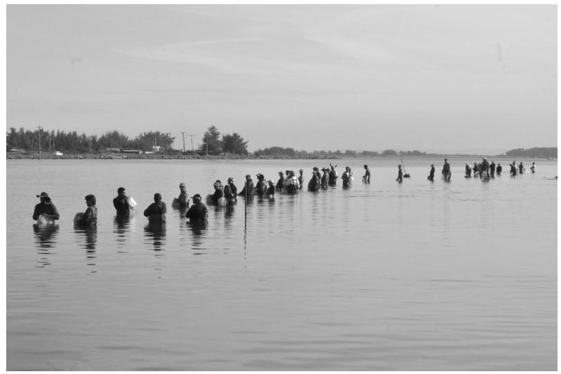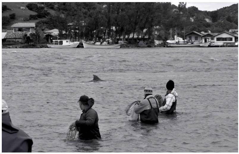 Essa tem sido a mais frequente pergunta, da parte de diferentes interlocutores, diante do que se passa em Laguna. De acordo com biólogos especialistas na “pesca cooperativa das tainhas”, como a atividade é designada, trata-se de “forrageio cooperativo”6. Os pescadores têm acesso a mais peixes, beneficiando-se dos cardumes conduzidos pelos golfinhos e da sinalização de sua localização em águas turvas. Os golfinhos usariam a barreira de homens como anteparo no cerco às tainhas e a desorganização dos cardumes provocada pelas tarrafas lançadas para capturar mais facilmente os peixes desnorteados. Desse modo, uns e outros obteriam recursos de forma mais vantajosa, otimizando gasto e consumo energéticos.