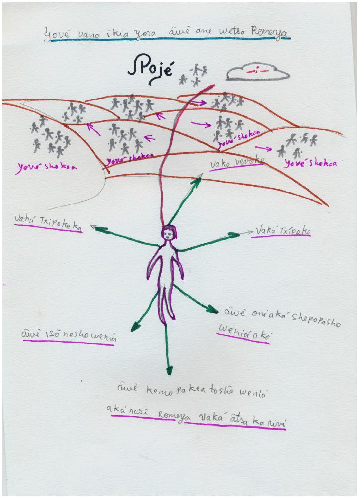 A imagem mostra a multiplicidade de duplos de que se constitui “pajé”, que, aqui como em outros mundos ameríndios, é uma posição provisória e instável, de saúde corporal frágil e inconstante, nem sempre apta a conter a dispersão potencial de seus aspectos. O desenho se divide, ainda, em dois eixos fundamentais, indicados pela direção superior ou inferior das setas. A tríade de duplos/setas superiores (que, na verdade, se completa por uma quarta linha não acabada, provavelmente elaborada para esquematizar o duplo do olho, verõ yochin) é aquela dos irmãos, caracterizada por um vínculo privilegiado com a multiplicidade dos agentes que costumamos chamar de “espíritos”. Esse vínculo se estabelece enquanto dura o corpo/posição do romeya, que congrega tais multiplicidades durante sua existência, mas, também, depois de sua morte ou desintegração, na qual os duplos passarão a viver com os espíritos aí distribuídos em suas colinas (matô), ou seja, em suas moradas infinitas. O eixo inferior, por sua vez, indicaria, no caso de uma pessoa ordinária, os duplos que não têm destino privilegiado e que permanecem aqui nesta terra sob a forma de espectros desgrenhados e desgarrados. À exceção, talvez, do duplo da urina, o romeya possui outros tantos duplos derivados de suas extensões “enteógenas” (a ayahuasca, o rapé e a saliva desprendida pelo consumo de tais extensões) que são também multiplicidades. Quando um pajé cospe no chão ou deixa derrubar a sua ayahuasca ou exala uma nuvem de pequenas partículas de rapé, ele prolifera uma multiplicidade de duplos que são também espécies de irmãos mais velhos.