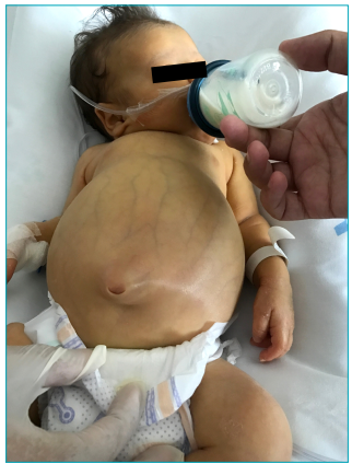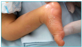 Menino, 34 dias, natural e procedente de cidade da região metropolitana do estado de São Paulo, encaminhado da Unidade Básica de Saúde (UBS) ao Hospital de Clínicas da Universidade Estadual de Campinas (HC Unicamp) por apresentar aumento do volume abdominal e icterícia progressiva há 2 semanas e hipocolia fecal na última semana. Trazia exames: hemoglobina (Hb): 8,1 g/dL, plaquetas: 85.000/mm3, bilirrubina total (BT): 13,3 mg/dL, bilirrubina direta (BD): 8,0 mg/dL, aspartato aminotransferase (AST): 220 U/L, alanina aminotransferase (ALT): 119 U/L, fosfatase alcalina (FALC): 684 U/L. Ultrassonografia abdominal: vesícula biliar contraída, hepatoesplenomegalia, ascite de pequeno volume e alças intestinais com paredes espessadas. Mãe relatava lesões avermelhadas com vesículas, bolhas e descamação na região palmo-plantar desde o nascimento.