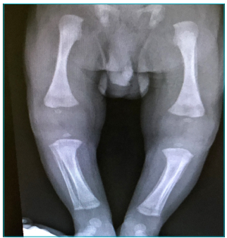 Ao exame físico de admissão ao hospital das clínicas, apresentava peso de 3680 g e perímetro cefálico 35 cm. Presença de lesões eritemato-descamativas em mãos e pés e exantema macular em região inguinal. Ao exame físico, identificou-se: ascite, icterícia ++/4+, fígado palpável a 5 cm do rebordo costal direito e baço palpável a 3 cm do rebordo costal esquerdo (Figuras 1 e 2). Exames laboratoriais: Hb: 7,3 g/dL, Plaquetas: 20.000/mm3, BT: 16,7 mg/dL, BD: 14,8 mg/dL, AST: 244 U/L, ALT: 105 U/L, Gama Glutamil Transferase (GGT): 95 U/L, FALC: 539 U/L, RNI: 1,24, R: 2,23. Sorologia sífilis: CMIA (quimioluminescência de micropartículas) reagente, VDRL 1:1024, TPHA (Treponema pallidum Hemaglutination) reagente, sorologias HIV, toxoplasmose, hepatites B e C e citomegalovírus não reagentes. Líquido cefalorraquidiano não foi coletado devido à plaquetopenia. Radiografia de ossos longos mostrava periostite simétrica e disseminada, bandas metafisárias lucentes e levantamento periosteal em fêmures, úmeros, ulnas e tíbias (Figura 3). Ultrassonografia transfontanela e fundo de olho sem alterações. Sorologia materna para sífilis (coletada imediatamente após o resultado positivo da criança): CMIA e TPHA reagentes, VDRL 1:256. Demais sorologias maternas negativas. Sorologia paterna para sífilis também reagente, realizada em UBS logo após o diagnóstico da criança. Pai não forneceu o resultado à equipe, bem como resultados das demais sorologias. Pai referia uso de substâncias psicoativas.