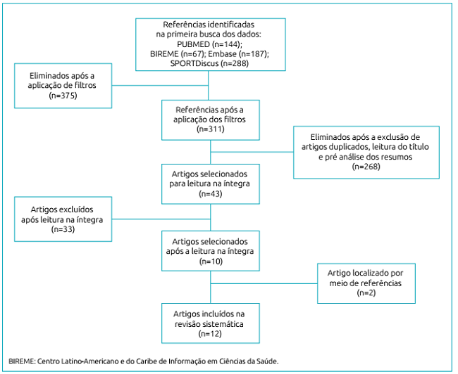 Posteriormente, dos 311 estudos resultantes, o total de 43 artigos foi identificado e classificado como potencialmente relevante para este estudo, procedendo-se à leitura dos referidos textos na íntegra. Efetuadas a leitura e a revisão dos textos completos, 31 artigos foram excluídos por não apresentarem os critérios de inclusão. Por fim, foram selecionados 12 artigos (representando 27,9% do total potencialmente identificado). O fluxograma do processo de seleção dos artigos é apresentado na Figura 1.