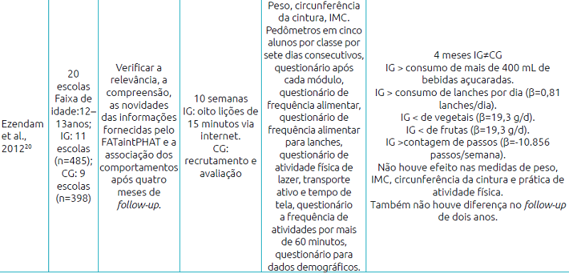 Ezembam et al.20 também disponibilizaram informações acerca de alimentação, atividade física, hábitos de vida e comportamento para o grupo intervenção (IG), porém essas informações foram disponibilizadas via internet e implementadas na escola por intermédio de professores treinados. O conteúdo foi dividido em oito módulos, com duração de 15 minutos cada um. O CG não recebeu nenhuma intervenção.