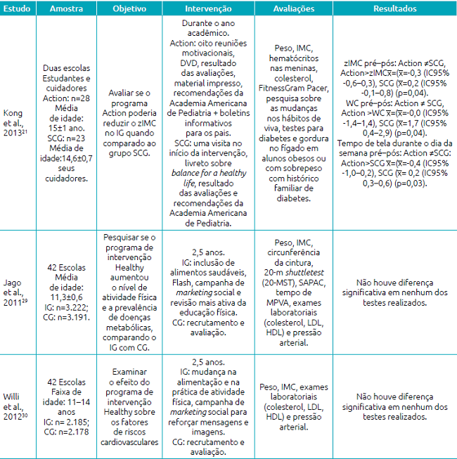 Outros três estudos21,29,30 realizaram intervenções educacionais associadas a intervenções nutricionais (Tabela 2). Kong et al.21 aplicaram um programa de intervenção durante o ano acadêmico em duas escolas - school-based health centers (SBHCs) - e estruturaram dois grupos para comparação: “intervention group” (Action) e “standard care group” (SCG). Ambos os grupos receberam uma visita inicial, na qual foi disponibilizado o resumo de todas as avaliações, juntamente com as recomendações da Academia Americana de Pediatria. No grupo Action, foi feita uma visita a cada duas ou três semanas, na qual foram abordados tópicos que os estudantes gostariam de discutir, totalizando-se oito visitas no ano acadêmico. Na primeira visita, os participantes receberam um DVD, um DVD player e boletins informativos. Para os cuidadores, foram entregues boletins informativos acerca de estratégias para redução do risco de obesidade.
