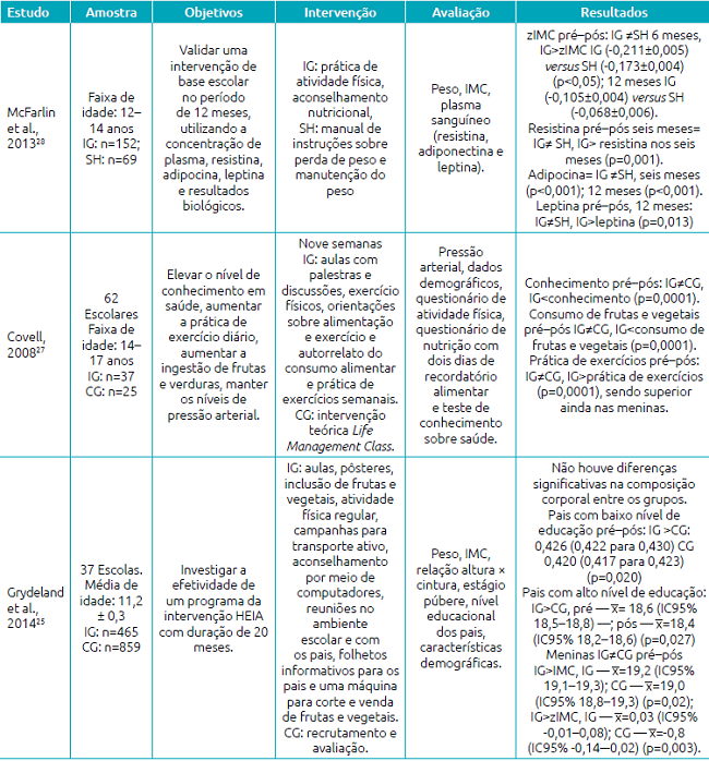Conclusions: Interventions based on physical activity and/or nutrition counseling were efficient and showed superior results in studies that associated the practice of physical activity with counseling. However, the need for new studies on educational interventions among schoolchildren and adolescents was made evident.