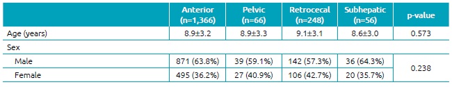 Métodos: Os prontuários de 1.736 pacientes pediátricos com idade ≤14 anos submetidos à apendicectomia laparoscópica em um período de 14 anos foram analisados retrospectivamente. Os pacientes foram divididos de acordo com a posição do apêndice: anterior, pélvica, retrocecal e sub-hepático. Os testes de Kruskal-Wallis e do qui-quadrado foram usados com a correção de Bonferroni, sendo significante p<0,05.