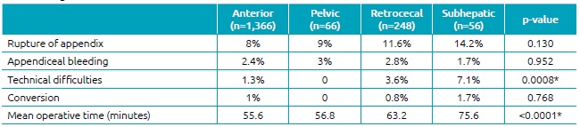 Results: The appendiceal location was anterior in 1,366 cases, retrocecal in 248 cases, pelvic in 66 cases and subhepatic in 56 cases. There were no significant differences between the groups in terms of patient age and gender. Abdominal pain was the only symptom with statistically significant differences between the groups. The rate of perforated appendicitis was higher in the subhepatic and pelvic positions. Intraoperative complications and conversions were not statistically significant. Technical difficulties and operative time were higher in subhepatic position. The rate of postoperative complications was similar between the different locations, except for bowel obstruction, which was higher in pelvic appendicitis.
