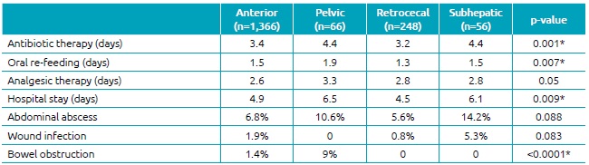 Postoperative outcomes are shown in Table 4. The antibiotic therapy was different after Bonferroni correction between retrocecal (3.2 days) and subhepatic (4.4 days) groups (p=0.006), as well as the oral re-feeding between pelvic (1.9 days) and retrocecal (1.3 days) groups (p=0.02). Moreover, there were statistical differences in the hospital stay between anterior (4.9 days) and subhepatic (6.1 days) groups (p=0.006) and retrocecal (4.5 days) and subhepatic groups (p=0.02). The rates of intra-abdominal abscess and wound infection were not statistically significant. However, the rate of bowel obstruction was different between anterior (1.4%) and pelvic (9%) groups (p<0.0001) and pelvic and retrocecal (0%) groups (p<0.0001).