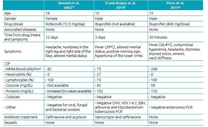 To our knowledge, there are only two published case reports of NSAIDs-induced aseptic meningitis that presented at pediatric age, caused by ibuprofen3 and rofecoxib,11 respectively. We summarize clinical and laboratorial features on Table 1.