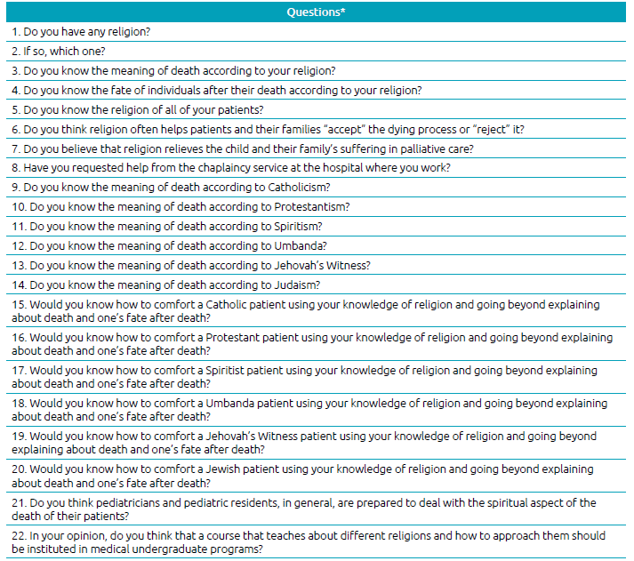 The questionnaire was composed of 22 closed questions with “yes” or “no” answers about participants’ knowledge and experience regarding pediatric patients’ religions. A request to participate in the survey was made once, in person, and the questionnaires were completed in person and in writing, immediately (Table 1).