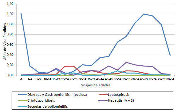 Para el trienio 2009-2011, se produce una leve disminución del impacto de las enfermedades relacionadas con el agua, que restan en conjunto apenas 11,47 años a la esperanza de vida de los argentinos, es decir, apenas una diferencia de 1,17 años de vida en un período de 9 años, con una velocidad de disminución del 1,07% por año. Este decremento se produce a expensas de las diarreas y gastroenteritis infecciosas, que pasan a restar sólo 8,26 AEVP a la población, aunque también, en menor proporción, las hepatitis y la leptospirosis, que restan en este período 1,59 y 0,79 AEVP, respectivamente. La velocidad de disminución de la prevalencia de estas enfermedades en las muertes sigue el mismo orden en cuanto a los años de vida que se pierden: el 1,77% anual para las diarreas; el 0,41% para la leptospirosis y el 0,29% para las hepatitis.