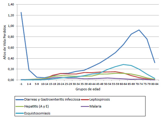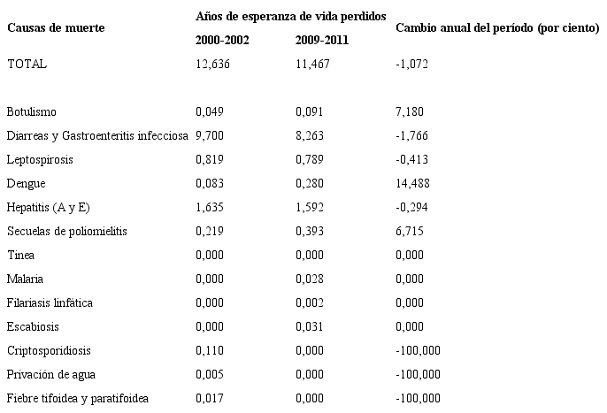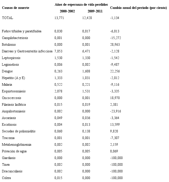 En el trienio 2009-2011, se evidencia una disminución de la mortalidad producida por las enfermedades relacionadas con el agua, que consumen para este período 12,43 años de la esperanza de vida de la población brasileña. En este caso, puede apreciarse que esa disminución se relaciona con la menor cantidad de años de vida perdidos por las diarreas y gastroenteritis infecciosas (6,47 AEVP), con una disminución porcentual anual del 2,13%, seguido de la esquistosomiasis con 1,53 AEVP (disminución porcentual del 3,34% anual), la malaria y la hepatitis con una disminución de 0,30 AEVP cada una y un cambio porcentual del 9,12% y del 2,81% anual, respectivamente; y la leptospirosis, que resta en este período 1,33 AEVP, con una velocidad de disminución de 1,54% anual.