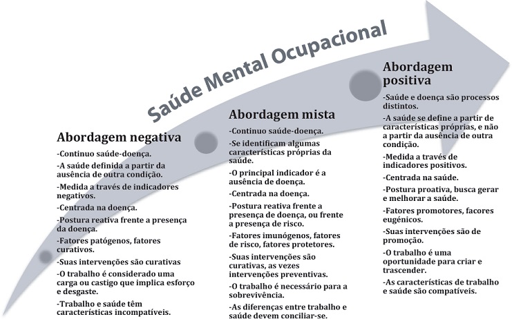 Dessa forma, a maioria das aproximações da conceptualização da saúde mental assumem de forma reativa uma abordagem negativa, focada na psicopatologia, nos transtornos mentais, nos agentes patógenos e - recentemente - nos imunógenos, enquanto que ainda são poucas as aproximações que abordam o tema desde uma perspectiva verdadeiramente positiva, e as desenvolvidas especificamente no âmbito ocupacional são escassas. Assim, nessa área é praticamente nulo o desenvolvimento de instrumentos válidos e fiáveis para sua avaliação, já que ficam restritos à conceptualização da saúde mental.