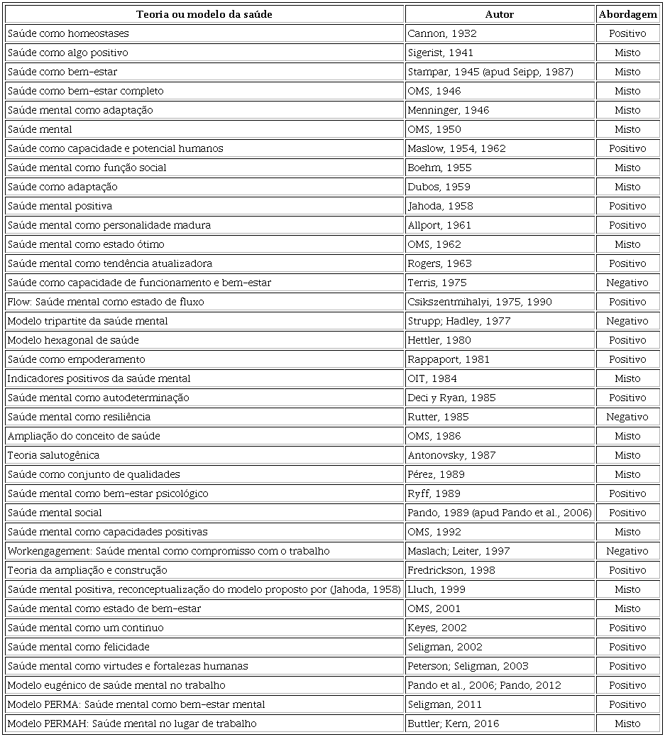 Os esforços realizados durante as últimas décadas para lograr desenvolver uma conceptualização positiva da saúde mental incluem a elaboração de distintas teorias e modelos psicológicos. Um deles é a psicologia positiva, postura que surge como um intento para consolidar uma abordagem positiva da psicologia no geral. Porém se requere estender seus alcances aos diversos âmbitos de desenvolvimento humano, dentre eles o ambiente laboral. Estamos numa etapa de transição que ainda não foi concretizada e podemos observar como muitas dessas propostas consideram a ausência de psicopatologia ou transtorno mental como principal indicador da presença de saúde mental. Outras propostas mostram de maneira tácita um enfoque reativo no qual, frente a presença de patologia ou de fatores de risco, busca-se intervir deixando de lado a verdadeira promoção da saúde ao voltar o foco de atenção para a preservação e a restauração da não doença.