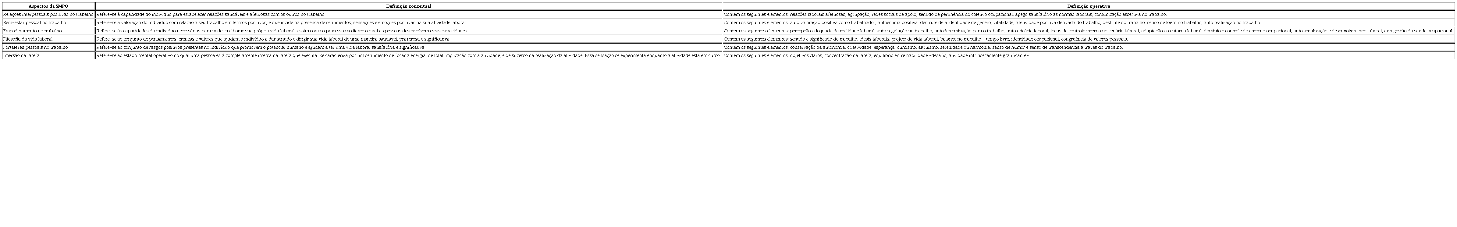 No Quadro 2, mostram-se as definições conceituais e operativas de cada um dos seis aspectos da saúde mental positiva ocupacional.