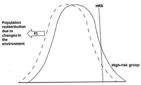 HRS and PS were seen as complementary strategies, but with the latter being more radical and effective than the former. Rose saw the population as an organic whole with changes in its entire distribution being more effective in reducing the overall burden of disease than targeting individual diseases. The PS approach aims to restore or facilitate biological homeostasis by creating a safer environment through removal of potential sources of ill-health. Therefore, changing social context into a healthier, fairer and less unequal environment has greater impact on human health (Wilkinson; Pickett, 2010). Figure 1 shows the left movement of whole risk factor distribution in a given population. PS is a powerful preventive intervention as it affects not only the high-risk, but also moderate to low risk individuals in the population.