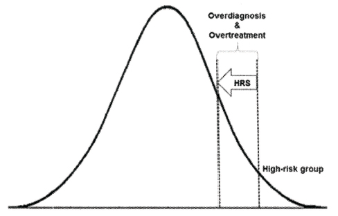 The low impact of HRS on population health should have limited its utility as main preventive strategy, but ‘experts’ in public health have solved the paradox to which it gives rise by gradually lowering the threshold for intervention in healthy people. Figure 2 shows the reduction of a cut-off point for defining a preventive intervention. This transforms numerous asymptomatic people into sick, requiring more medical interventions and follow-ups. Thus, HRS leads inevitably to overdiagnosis and overtreatment as most individuals will not benefit from medical interventions.