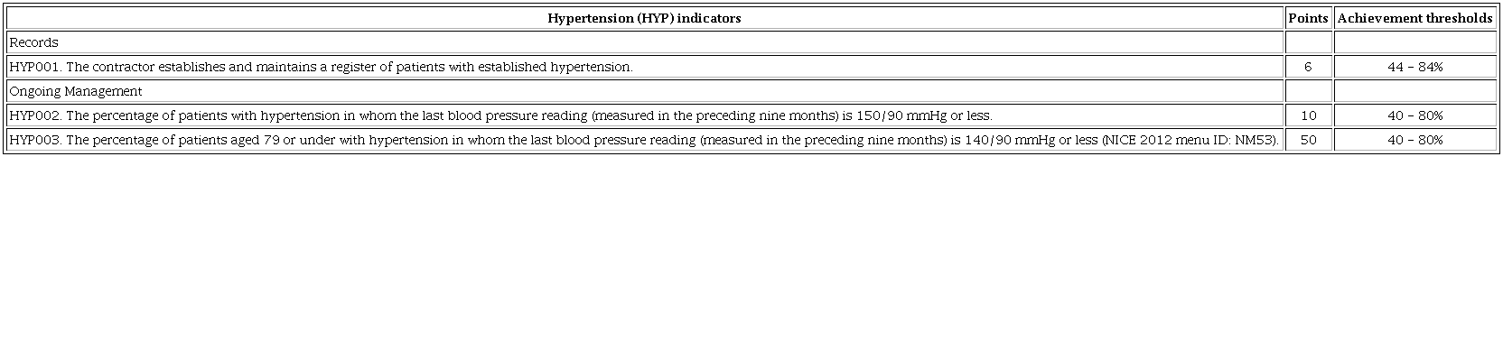 The QOF as a pay-for-performance scheme consists of a point-based system that rewards UK general practice for achieving certain standards on pre-agreed clinical disease criteria. The aim has been to improve the quality of clinical care in general practice by setting an evidence-based clinical governance framework. The QOF 2013/2014 contract year offered 900 points and was organised into four domains: Clinical, Public Health, Quality and Productivity, and Patient Experience (Norman; Russell; Merli, 2016). In some QOF clinical indicators policymakers have manipulated cut-off points for intervention and/or the range of points achievement of target-disease as mean of optimising treatment (Doran et al., 2014). In the QOF 2013/2014 contract this strategy was clearly used in regard to hypertension: QOF has tightened the hypertension target by placing fifty points (i.e. more money) to a ‘newly’ introduced QOF hypertension indicator HYP003 (requiring the blood pressure to be below 140/90) against ten points for HYP002 (requiring blood pressure to be below 150/90 - Table 2). This led to the inclusion of more patients under a tight blood pressure control.