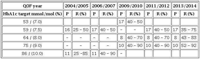 The QOF indicators for diabetes are another example of how policymakers have played with cut-off points and the upper-end threshold of a disease management quality standard. One of the criteria for a good diabetes control is through monitoring the level of haemoglobin A1c (HbA1c). Table 3 illustrates the fluctuation in HbA1c targeting and the increase in quality standards by expanding the upper range for maximum points. This leads to more patients on tighter diabetes control regimens and increase in medication usage.