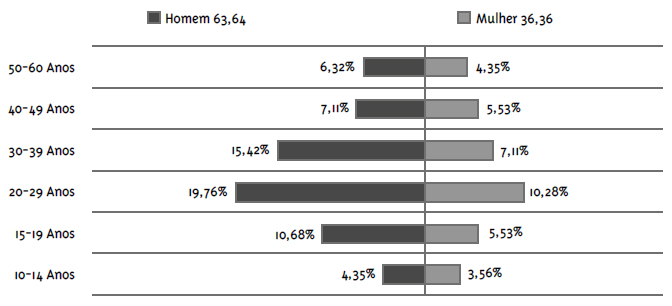 A predominância de pessoas do sexo masculino ocorreu em todas as faixas etárias, e maioria dos pacientes, de ambos os sexos, tinha entre 20 e 29 anos de idade. Entretanto, nos homens a incidência foi aproximadamente o dobro da em mulheres, correspondendo ao segmento da população economicamente ativa.