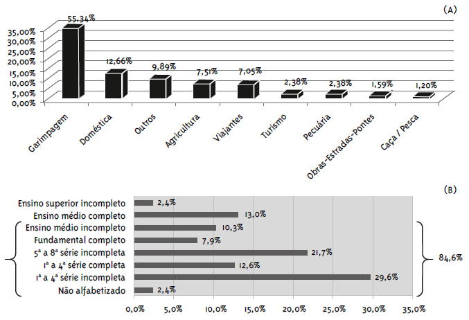 Por outro lado, o nível de escolaridade também foi importante na análise dos determinantes da saúde, apontando que a baixa escolaridade é uma variável social-chave para compreender o risco de malária na região. Ela limita a procura por emprego formal, levando os profissionais a buscar alternativas econômicas comuns nessa região da fronteira, como os garimpos clandestinos, o que contribui para a permanência da enfermidade.
