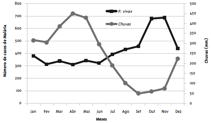 Ao comparar a variabilidade intra-anual da precipitação mensal com a incidência de malária no período de estudo, um platô foi observado para o P. vivax em outubro e novembro (meses mais secos). Observa-se, portanto, forte correlação negativa (r de Pearson −0,7819; p=0,0024) entre as médias mensais das precipitações acumuladas entre janeiro e dezembro com a taxa de incidência da malária por P. vivax (p=0,0026). Porém, observou-se pelo coeficiente de correlação de Pearson que somente parte da incidência da malária, ou seja, 78% (198/253), está associada de forma inversa à precipitação pluviométrica.