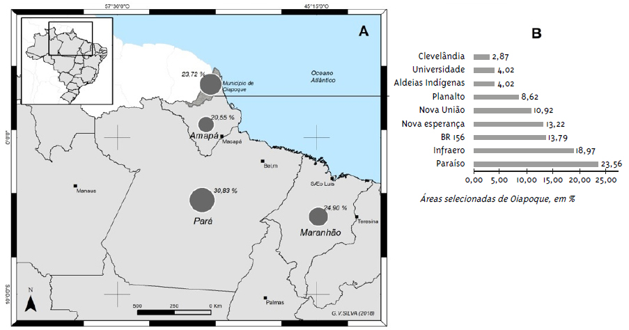 Nossa área de estudo é o município de Oiapoque, localizado na fronteira setentrional brasileira, distante cerca de 600 quilômetros de Macapá, capital do estado do Amapá. Oiapoque interage com duas comunas da Guiana Francesa, Saint-Georges-de-l’Oyapock, com a qual tem relações comerciais e sociais fortes (cidade gêmea), e Camopi, localizada na outra margem do rio Oiapoque, em frente à pequena localidade brasileira de Vila Brasil (Silva, 2013).