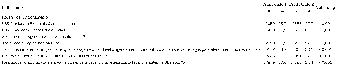 A tabela 1 apresenta os indicadores PMAQ-AB de primeiro contato, nas dimensões horário de funcionamento, acolhimento e agendamento de consultas na AB. Os resultados das variáveis referentes ao horário de funcionamento apresentaram elevação na quantidade de dias, porém com redução na quantidade de horas por dia. A implantação do acolhimento (de 80,9% para 97,6%) e reserva de vagas para atendimento no mesmo dia (de 64,9% para 88,1%) tiveram resultados ampliados. Já nos indicadores sobre agendamento de consulta, o ponto positivo é que reduziu a proporção de usuários que, para marcar consulta, precisam fazer fila e pegar ficha antes da UBS abrir. Todavia, observou-se redução de UBS que realizam a marcação de consultas todos os dias da semana (de 55,2% em 2012 para 47,0% em 2014).