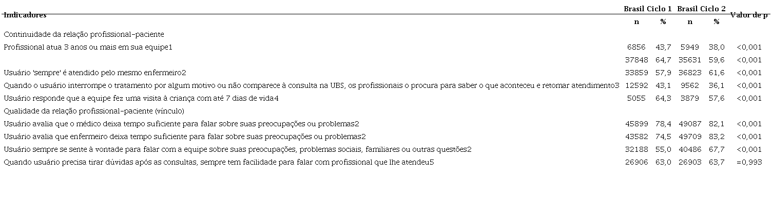 Na continuidade da relação profissional-paciente, observaram-se resultados inferiores no ciclo 2 para a maior parte das variáveis. O único resultado superior encontrado no ciclo 2 foi o usuário ser sempre atendido pelo mesmo enfermeiro na UBS, de 57,9% para 61,6% (tabela 2). A continuidade da relação profissional-paciente mostrou baixos resultados em ambos os ciclos. Os indicadores de vínculo apresentaram leve melhora principalmente quanto ao usuário sentir-se à vontade em conversar com a equipe, contudo, ainda demandando preocupação.