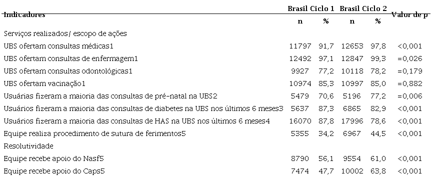 Em relação ao escopo de ações, observam-se alguns resultados superiores no ciclo 2, que se referem às consultas de médicos, realização pelas usuárias de pré-natal na UBS (de 70,6% para 77,2%) e realização do procedimento sutura de ferimentos. Contudo, percebem-se valores inferiores no ciclo 2 quanto à realização pelos usuários da maioria de consultas de hipertensão e diabetes na UBS.