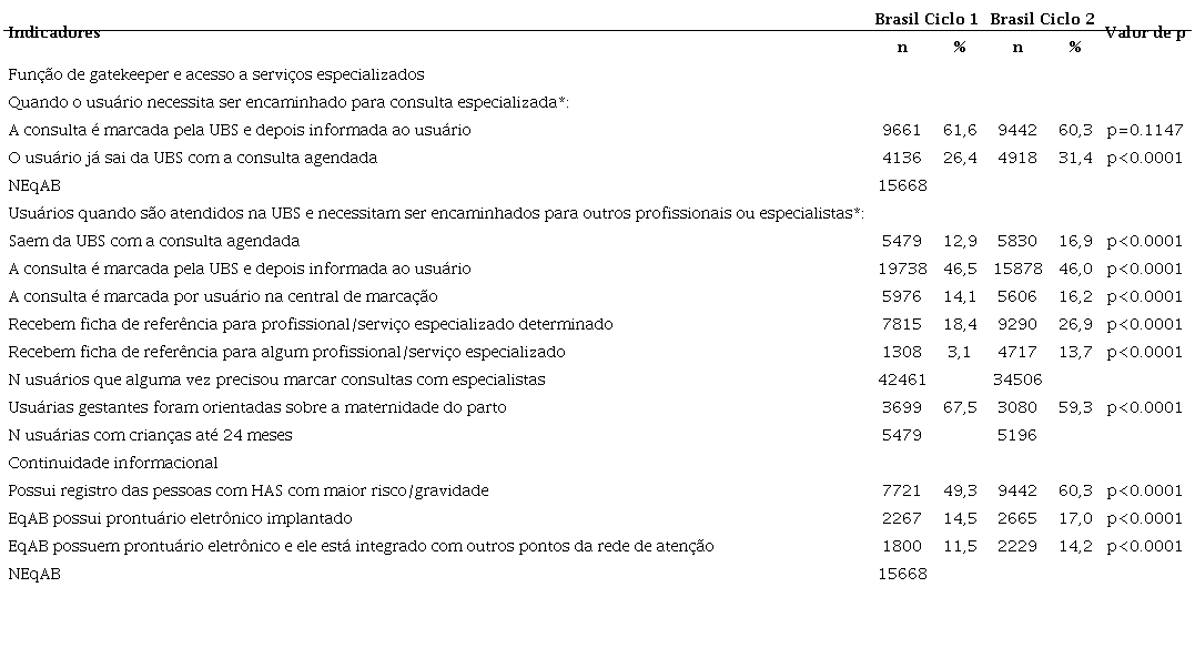 Na comparação entre os dois ciclos, os resultados foram diversificados. Na dimensão função de gatekeeper e acesso a serviços especializados, manteve-se a proporção de equipes que afirmaram que a consulta especializada é marcada pela UBS e depois informada ao usuário (cerca de 60%), mas aumentou o número de equipes que afirmaram que os usuários já saem com a consulta agendada (26,4% para 31,4%). Pelos resultados encontrados, houve aumento estatisticamente significativo em todas as formas de marcação (comparando ciclo 1 com ciclo 2). É nítida a necessidade de melhora na responsabilidade de marcação de consulta pela UBS, pois apenas cerca de metade dos usuários informou que a UBS marca consulta especializada. Negativamente, fica a observação do aumento de usuários que recebem ficha para 'algum' (indeterminado) serviço especializado (3,1% para 13,7%). Vale destacar também que a referida pergunta admitia múltiplas respostas, e isso foi um fator que dificultou a análise.